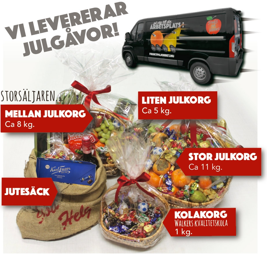 Vi vet att du i jultid gärna vill visa uppskattning till dina kollegor, anställda, leverantörer, samarbetspartners osv. Våra fräscha julkorgar passar perfekt för detta! Det är enkelt – kontakta oss redan idag så ordnar vi julgåvor som garanterat kommer att bli uppskattade. Innehållet i korgarna kan variera från år till år.